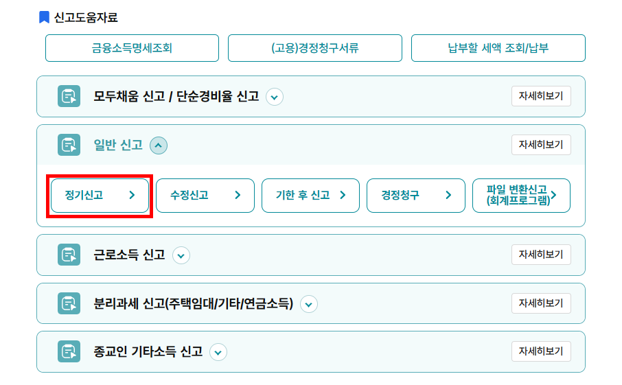 - [신고/납부] > [종합소득세 신고] > [일반 신고] > [정기 신고 작성] 메뉴 클릭