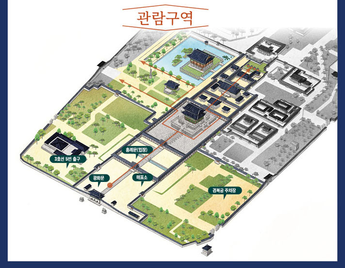 - 개방 권역: 광화문, 흥례문, 근정전, 경회루, 사정전, 강녕전, 교태전, 아미산