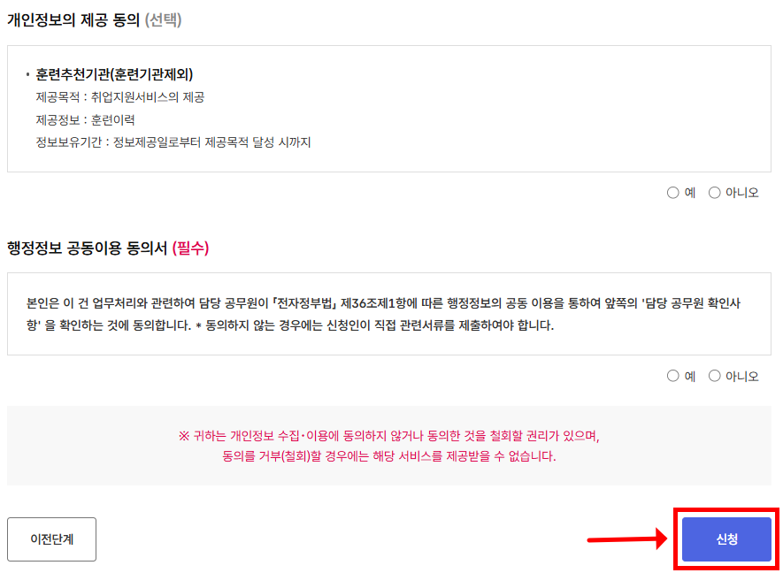 5. 개인정보의 수집ㆍ이용 및 제공 동의 및 신청 완료