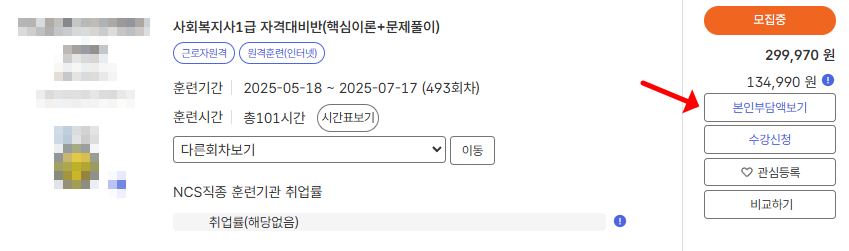 TIP: 수강 신청 전에 본인이 내일배움카드 사용 가능 여부와 훈련비 지원율을 다시 한 번 확인하세요!