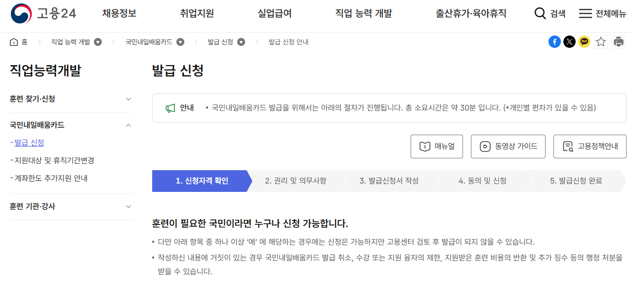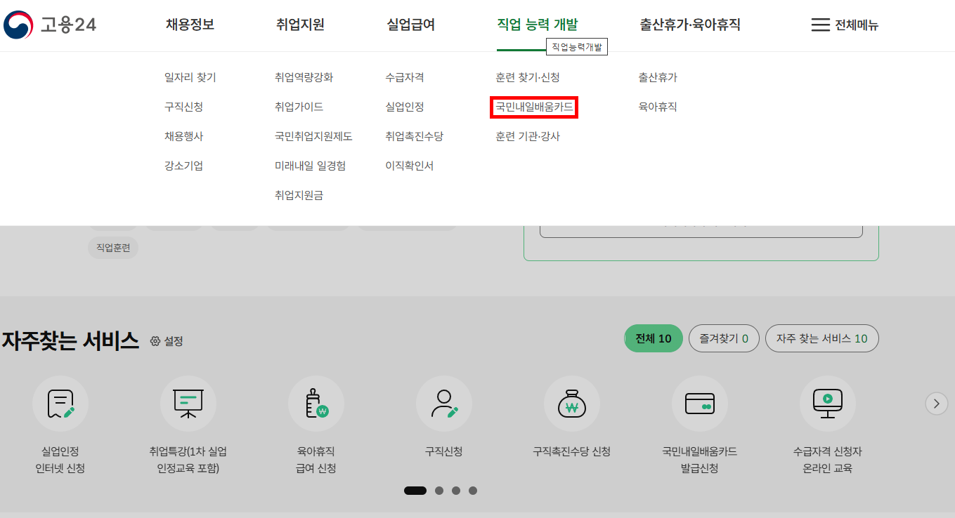 2. 메인화면에서 '직업 능력 개발' > ‘국민내일배움카드’ 클릭