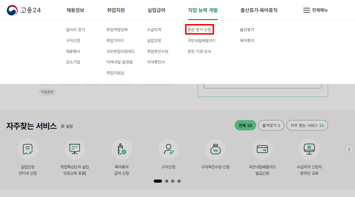 - 로그인 후 상단 ‘훈련찾기·신청’ 메뉴 클릭