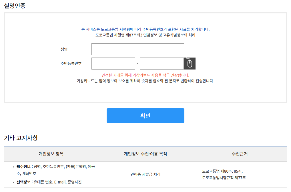 - 절차: 실명 인증 → 약관 동의 → 면허정보 확인 및 분실 여부 체크 → 수령 방법 선택 → 연락처 등록 및 결제