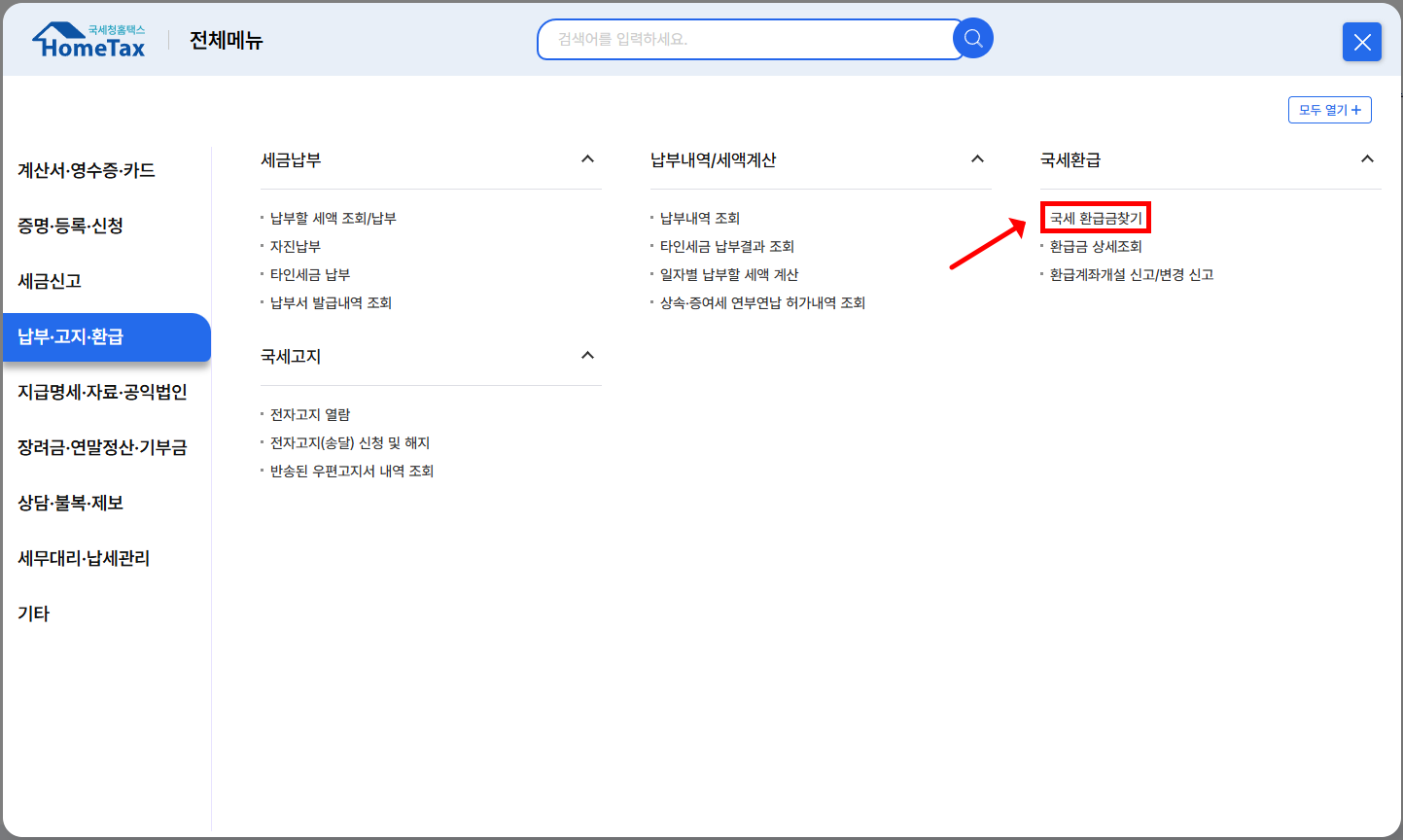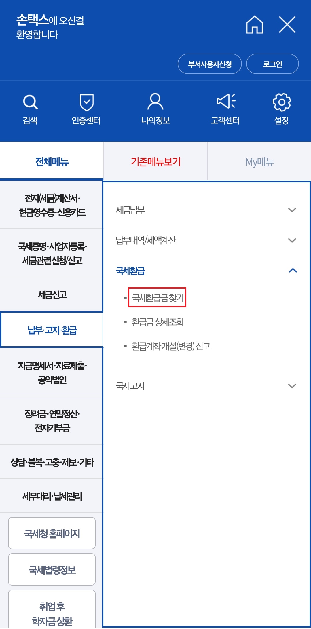- 로그인 → [납부/고지/환급] → [국세환급금 찾기]