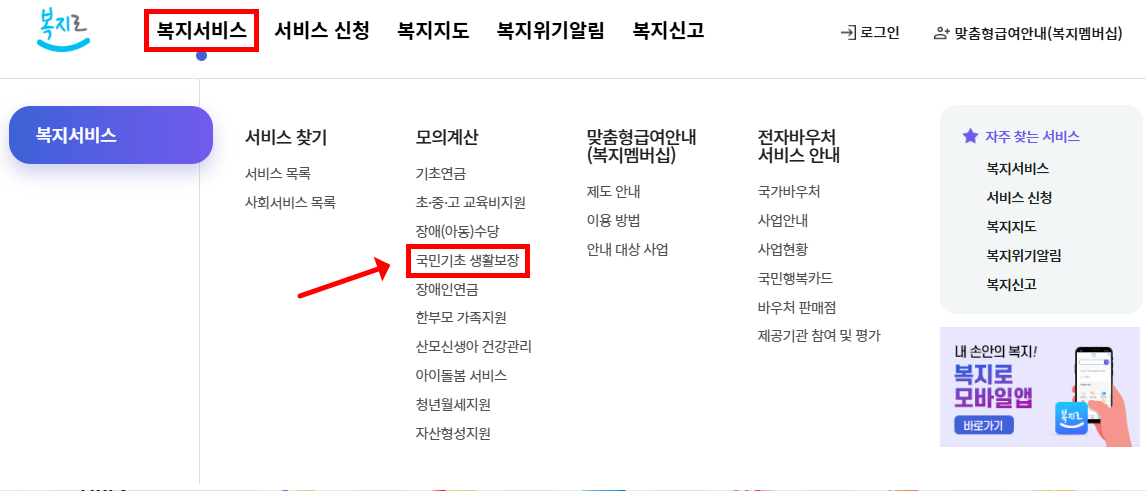 - 복지로 홈페이지: 복지로에서 '복지서비스' > '모의계산' > '국민기초 생활보장' 메뉴를 통해 소득·재산을 입력하여 가능 여부를 확인할 수 있으며 신청도 가능합니다.