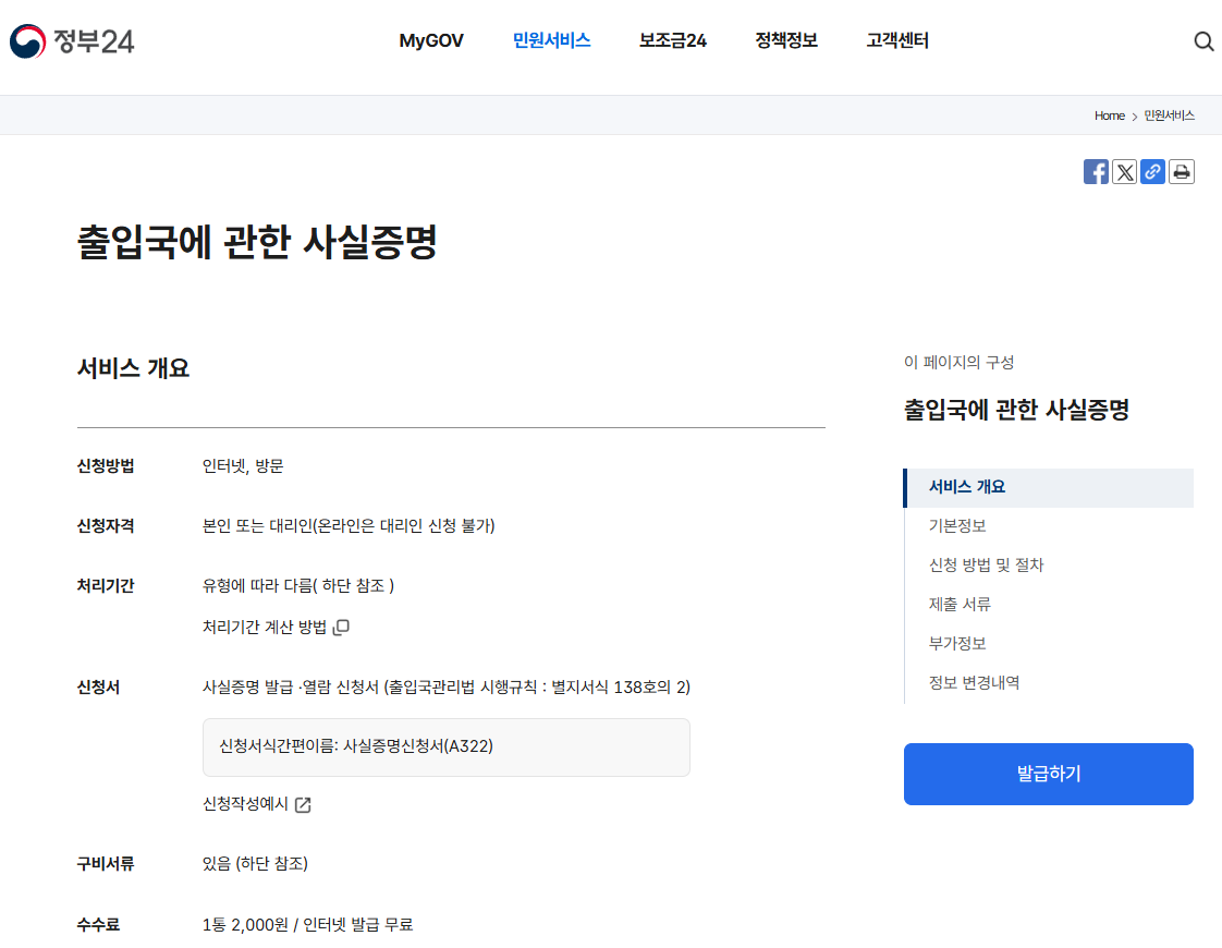 - 출입국사실증명서 인터넷발급은 정부24에서 무료로 5분 내 가능