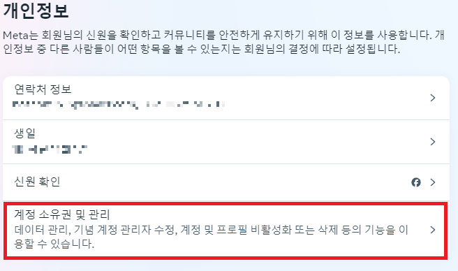 - 좌측 메뉴에서 ‘개인정보’ 클릭 → ‘계정 소유권 및 관리’