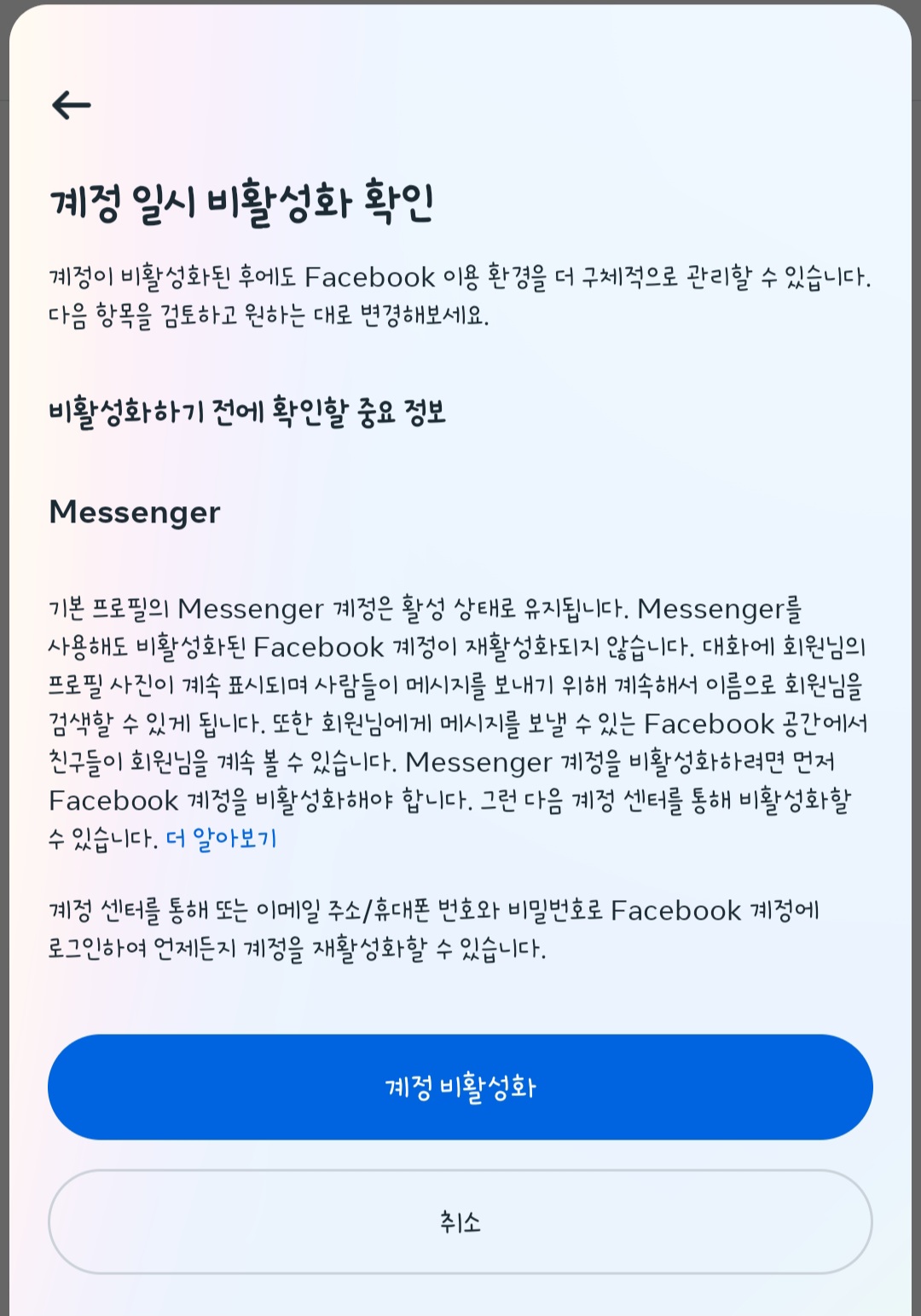 - 메신저는 그대로 사용할 수 있어 완전한 탈퇴 전 임시 조치로 적합합니다.