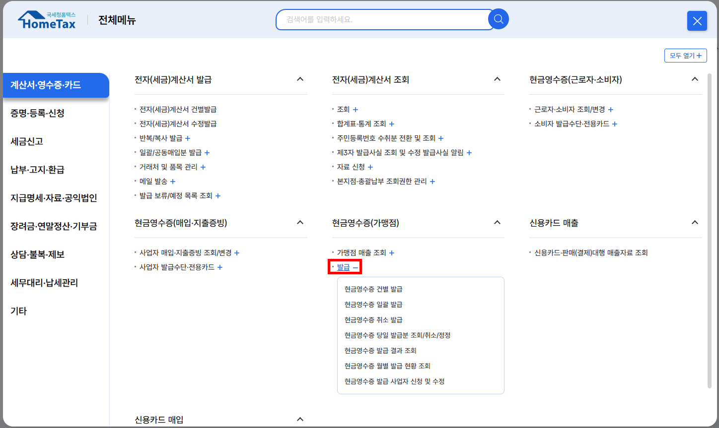 - 로그인 후 '계산서·영수증·카드' > ‘현금영수증 발급’ 메뉴 선택