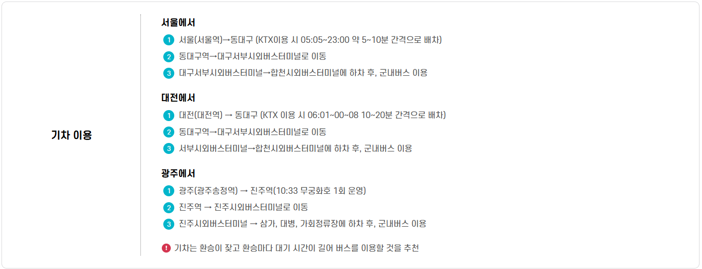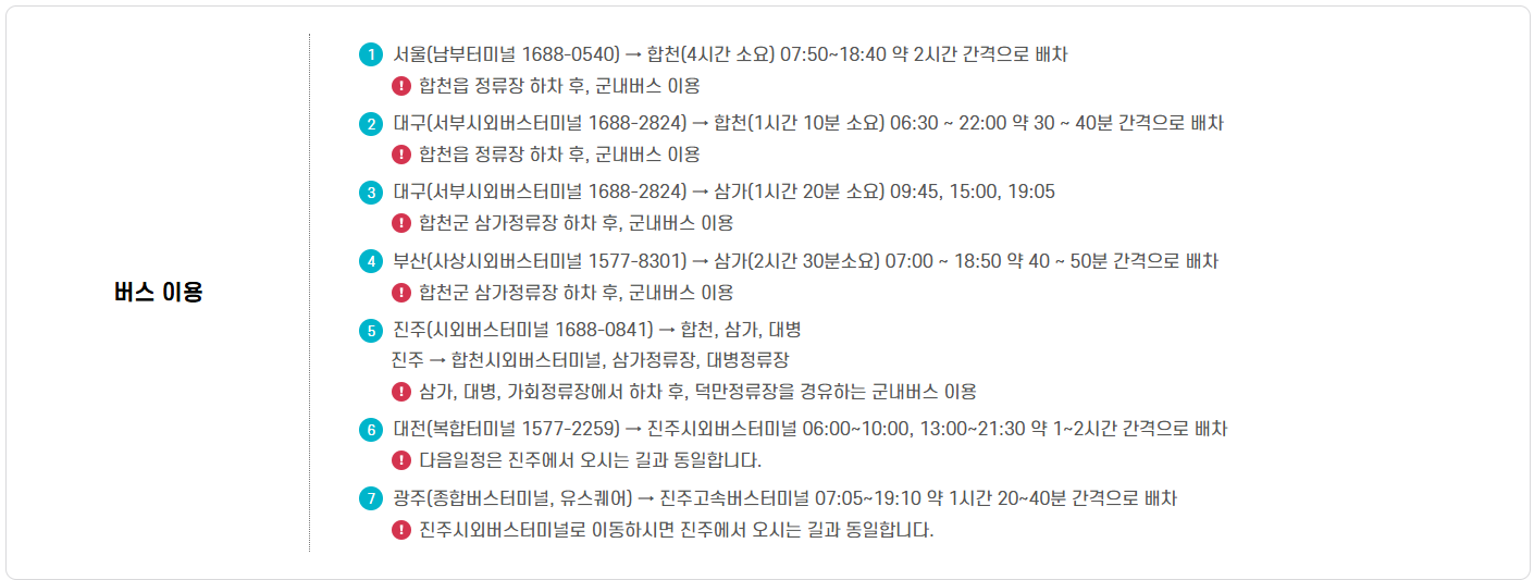 합천터미널 → 가회면행 버스 → 황매산 입구 하차 후 도보 또는 셔틀버스 이용 - 주차 및 교통 통제 안내